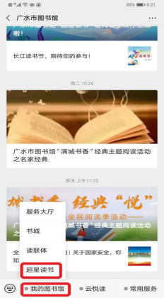 2、点击下方“我的图书馆”栏目——选择“超星读书”,进入
