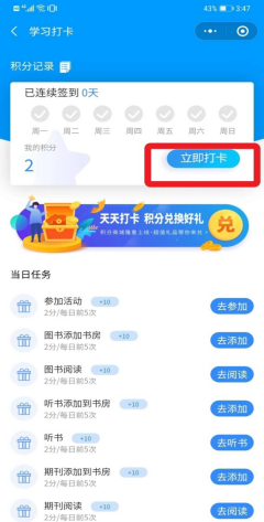3、点击“学习打卡”进入活动页面,完成每日打卡及读书任务